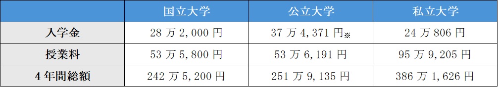 ※公立大学入学料は地域外からの入学者の平均