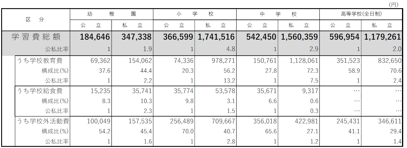 出典:文部科学省「令和5年度子供の学習費調査」
